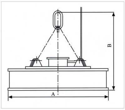 用于吊運(yùn)大型鋼錠、連鑄板坯、厚鋼板。吊運(yùn)6m 以上板坯時(shí)為了避免偏心而產(chǎn)生傾斜,請(qǐng)使用兩臺(tái)電磁鐵聯(lián)吊。