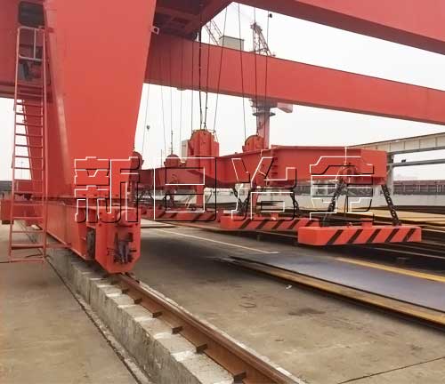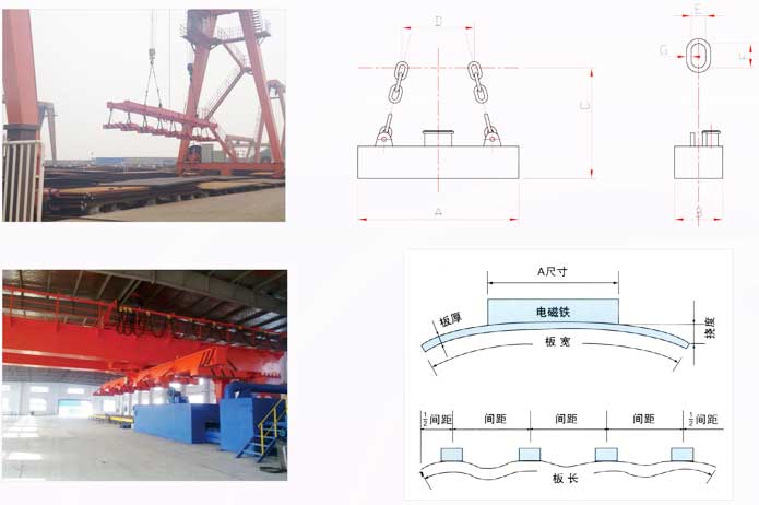 本系列產(chǎn)品專為吊運(yùn)鋼板而設(shè)計,吊運(yùn)作業(yè)安全、迅速、準(zhǔn)確。選型時應(yīng)考慮作業(yè)時鋼板彎曲變形將影響安全搬運(yùn),必須注意電磁鐵的長度與鋼板厚度和板寬之間的關(guān)系,同時考慮長鋼板吊運(yùn)時可能出現(xiàn)彎曲變形而影響安全搬運(yùn),所以在吊運(yùn)長尺寸鋼板時,請使用多臺電磁鐵聯(lián)用,對于中厚板(6mm~32mm)電磁鐵的間距以3~4 米為宜,兩端外伸部分的長度取間距的二分之一。